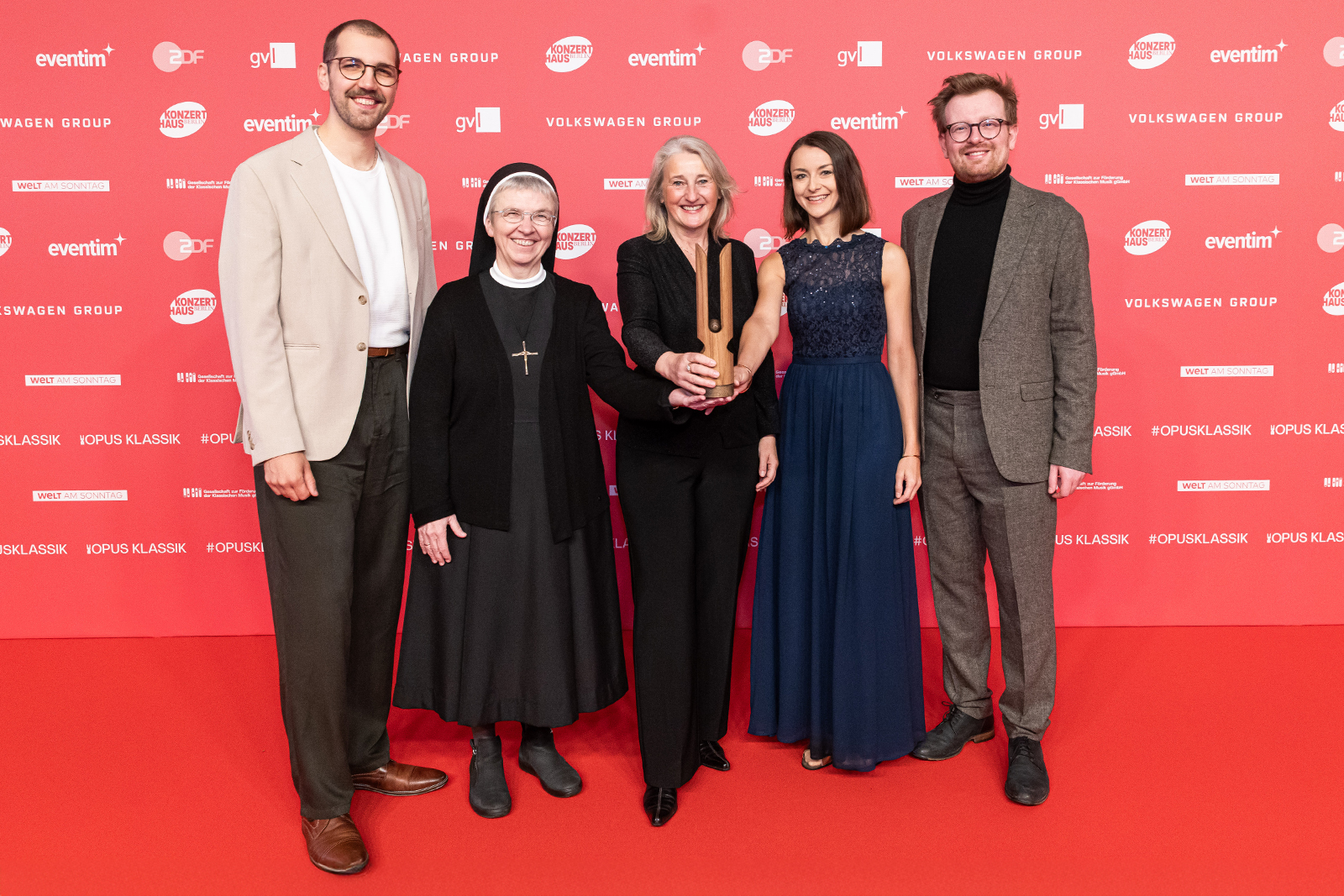 Intendantin Evelyn Meining, Regisseur Max Koch, Produktionsdramaturgin Tamara Yasmin Quick, Bühnen- und Kostümbildner Thorben Schumüller und Generaloberin Schwester Monika Edinger voller Freude und Überwältigung. »Wir hätten mit sowas ja gar nicht gerechnet«, resümiert die Ordensschwester. Es ist ein besonderes Wochenende für die gesamte Kongregation, von der eine Abordnung mit nach Berlin gereist ist. Der OPUS KLASSIK ist eine Gemeinschaftsleistung: »Wir freuen uns sehr, dass wir diese bedeutende Auszeichnung erhalten haben – nicht nur für uns, sondern vor allem für die vielen Menschen, die an diesem Projekt beteiligt waren«, betont Tamara Yasmin Quick.